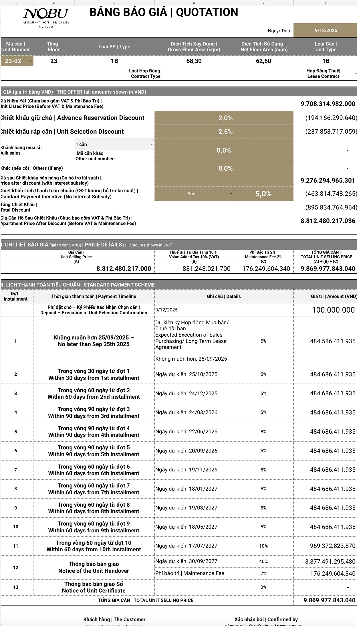 Lịch thanh toán NOBU giãn 24 tháng (2025–2027) - 09/2025: Đặt cọc 100 triệu