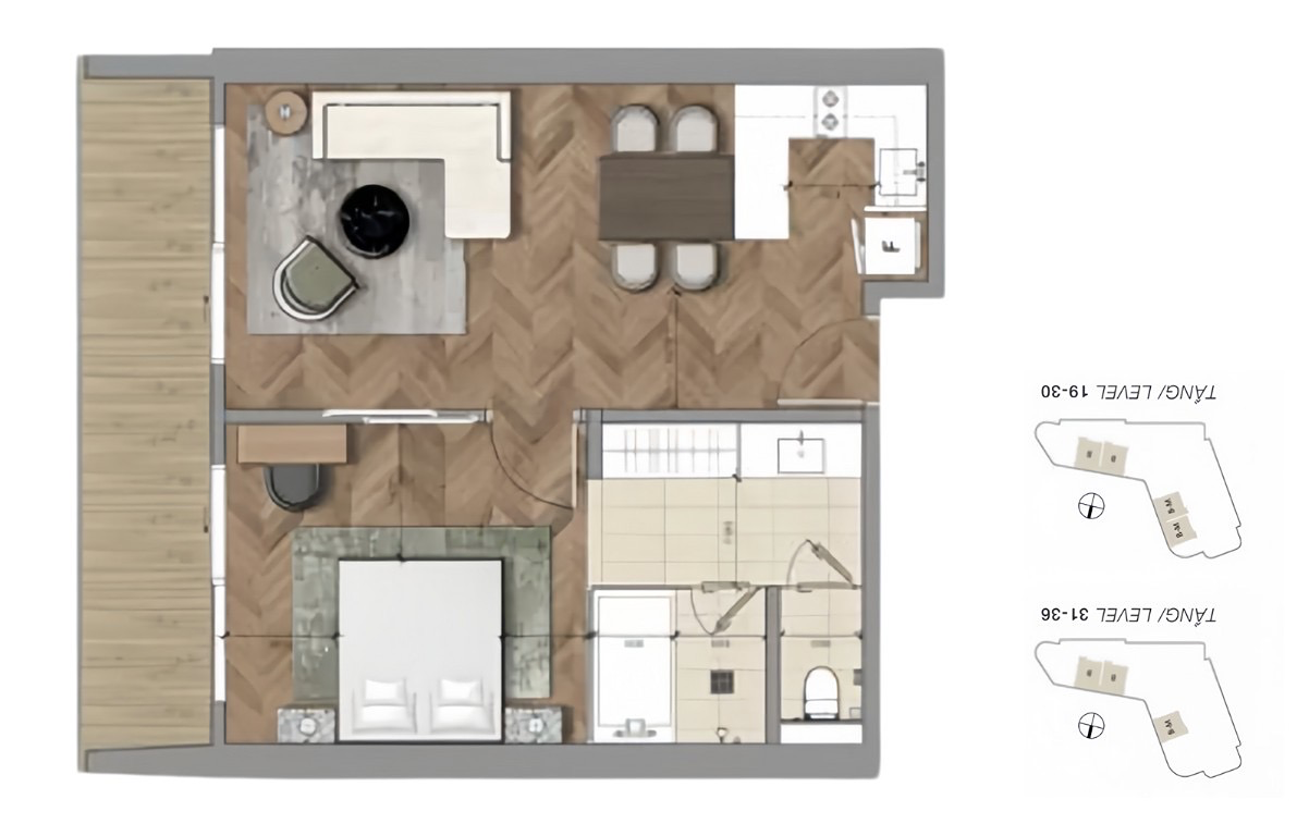 - Diện tích: 68,3m² (sử dụng 62,6m²)