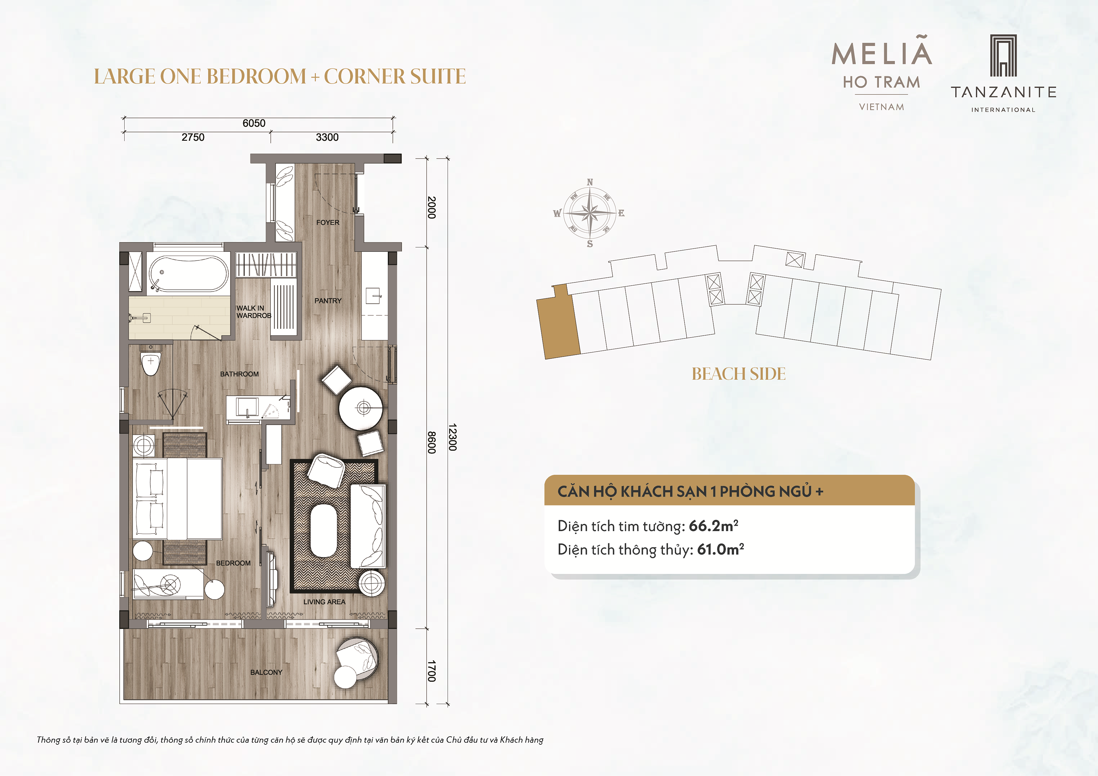 Layout: 1 phòng ngủ riêng biệt – phòng khách – bếp – 1 WC – ban công view biển/hồ bơi/khu vườn