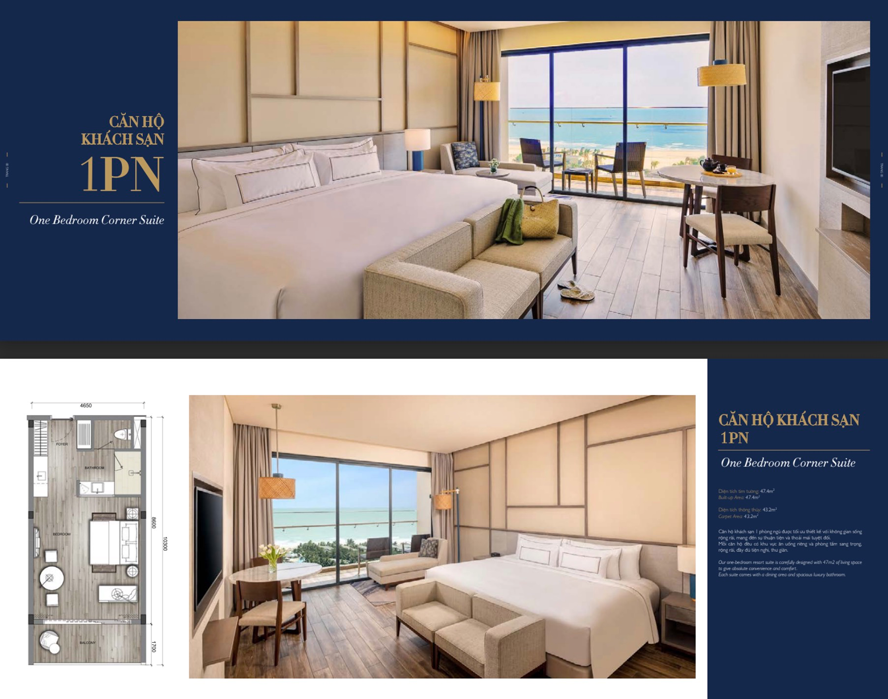 Căn hộ 1PN được thiết kế hiện đại, tối ưu diện tích, tất cả phòng đều đón gió và ánh sáng tự nhiên. Nội thất bàn giao cao cấp theo tiêu chuẩn Meliá quốc tế.
