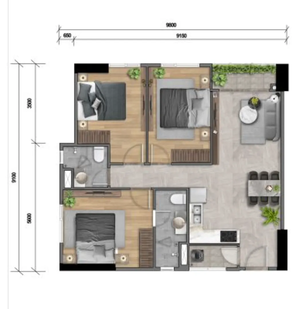 Kết cấu: 3PN-2WC