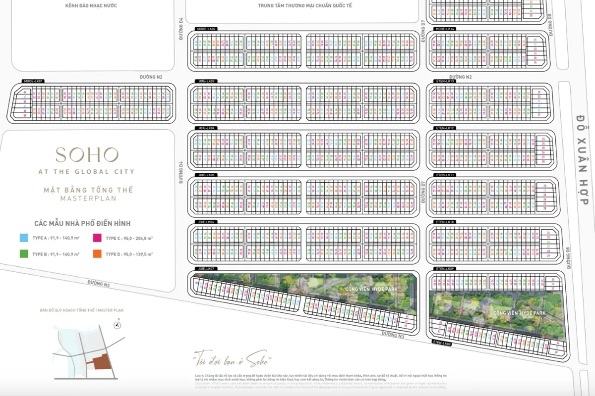 Lấy cảm hứng từ những khu phố sầm uất hàng đầu thế giới, SOHO sở hữu vị trí trung tâm sôi động nhất The Global City, ngay cửa ngõ đường Đỗ Xuân Hợp, kết nối trực tiếp Võ Nguyên Giáp, cao tốc Long Thành – Dầu Giây và Nguyễn Duy Trinh. Từ đây, cư dân và du khách dễ dàng tiếp cận trung tâm thương mại, tổ hợp giải trí – thể thao, chuỗi tiện ích đặc quyền cùng các phân khu cao và thấp tầng, bao quanh bởi công viên xanh mát.