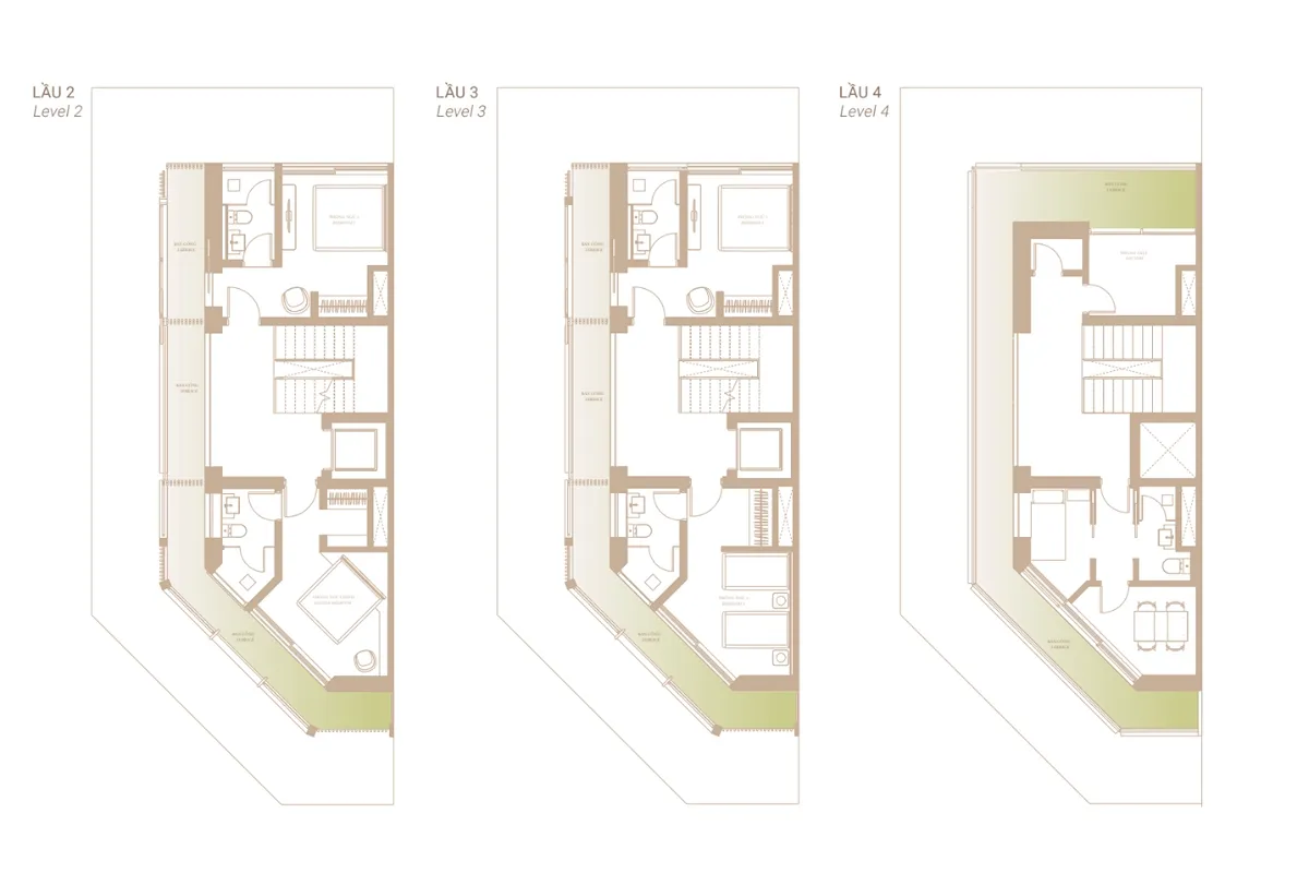 - Kết cấu: 1 trệt, 4 lầu, sân thượng; 4–5 phòng ngủ có WC riêng